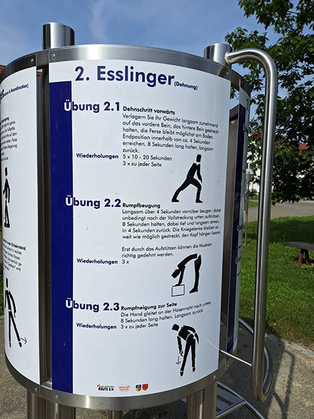Die 5 Esslinger nach Dr. Martin Runge sind ein qualifiziertes Bewegungsprogramm für Menschen in der zweiten Lebenshälfte. An der Station können Balance, Kraft, Schnelligkeit, Beweglichkeit und Koordination trainiert werden. Alle Übungen sind exakt beschildert.